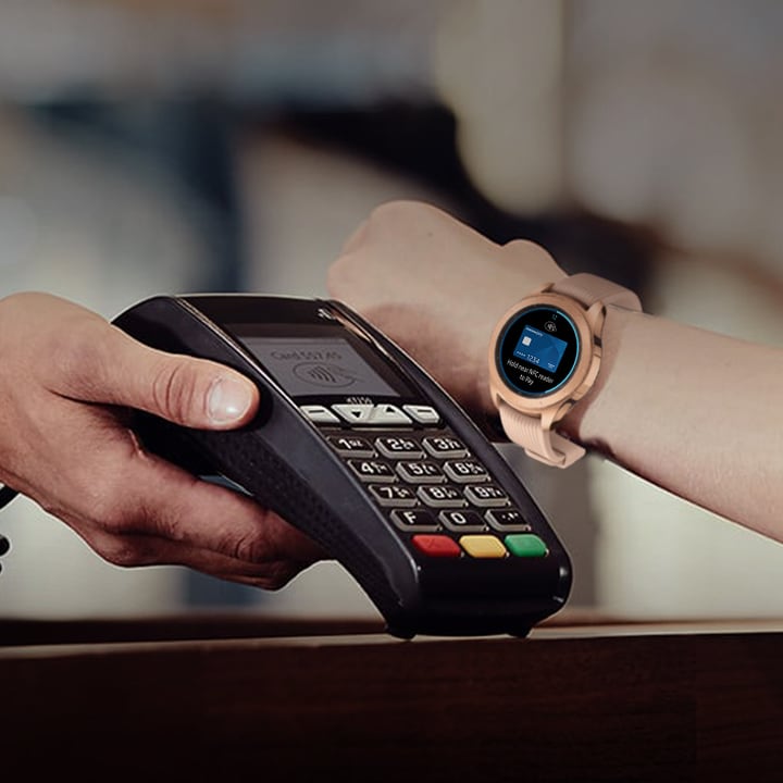 Với Samsung Pay trên Galaxy Watch, việc mua hàng chỉ cần thao tác nhẹ nhàng trên cổ tay - không cần phải đem theo tiền hay ví*.
